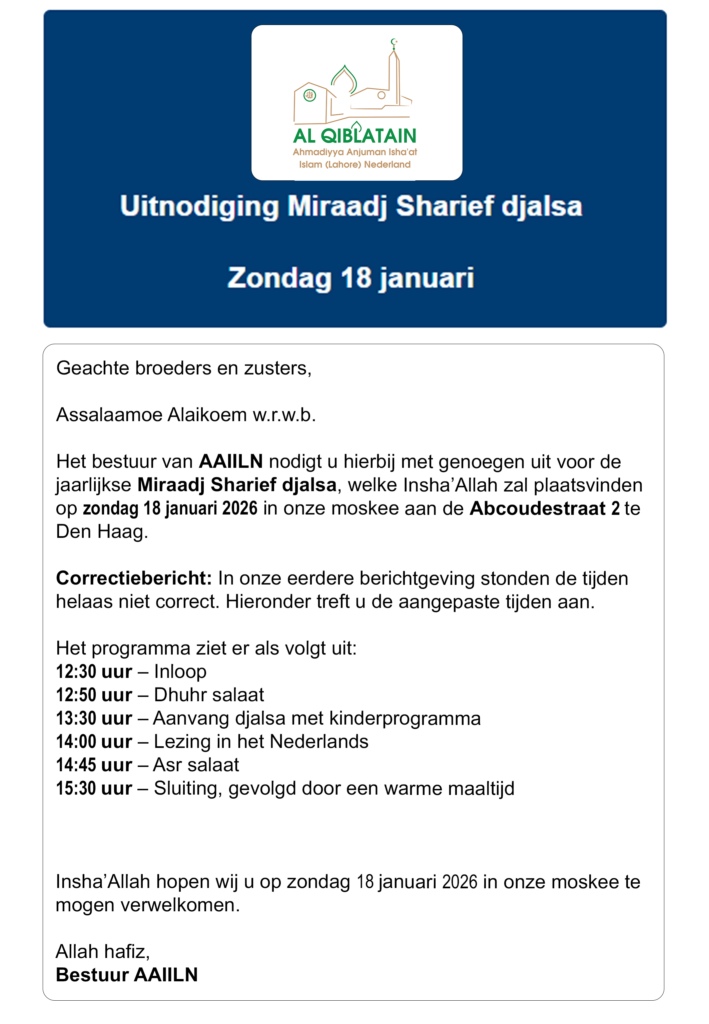 op de website van de 'Ahmadiyya Anjuman Isha'at-e-Islam (Lahore) Nederland' - vereniging voor de verspreiding van de Islam '. De Lahore Ahmadiyya Anjuman staat voor een vreedzame en progressieve samenleving. Een samenleving die gevrijwaard moet zijn van elke vorm van geweld en haat en gebaseerd is op respect voor een ieder, ongeacht geloofsovertuiging, afkomst, ras of geslacht. Het doel van deze website is: U te informeren over de Islam, onze opvattingen en de activiteiten binnen onze organisatie.